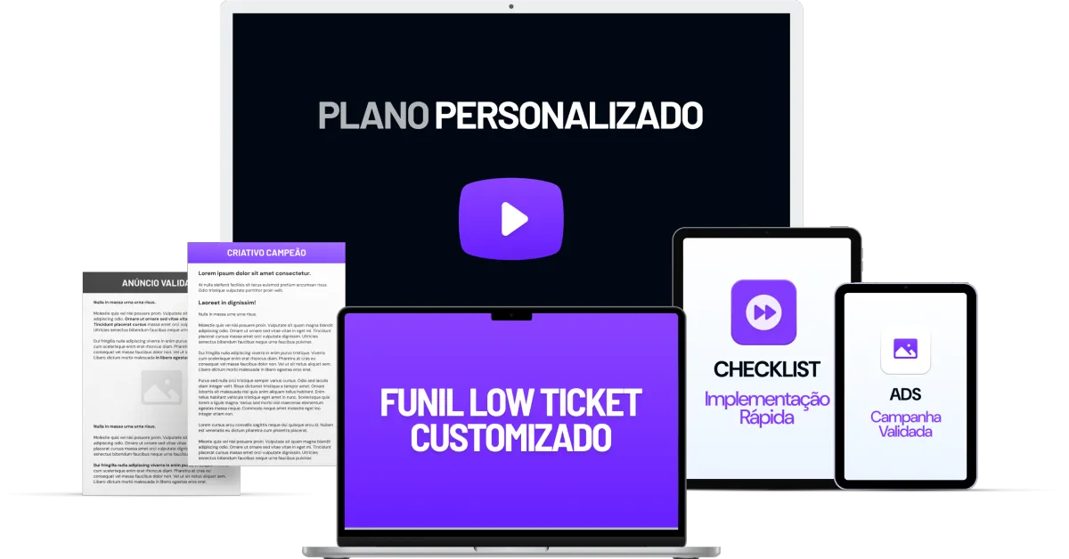 Além da estrutura e do modelo de criativo campeão, você também vai receber tudo o que precisa para escalar seu low ticket com segurança.